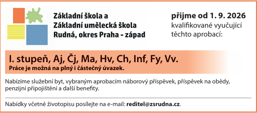 Základní škola a Základní umělecká škola Rudná, okres Praha – západ přijme školního psychologa s nástupem IHNED. Více informací u ředitele školy Mgr. Pavla Kasala, tel. 602 885 790, email: reditel@zsrudna.cz