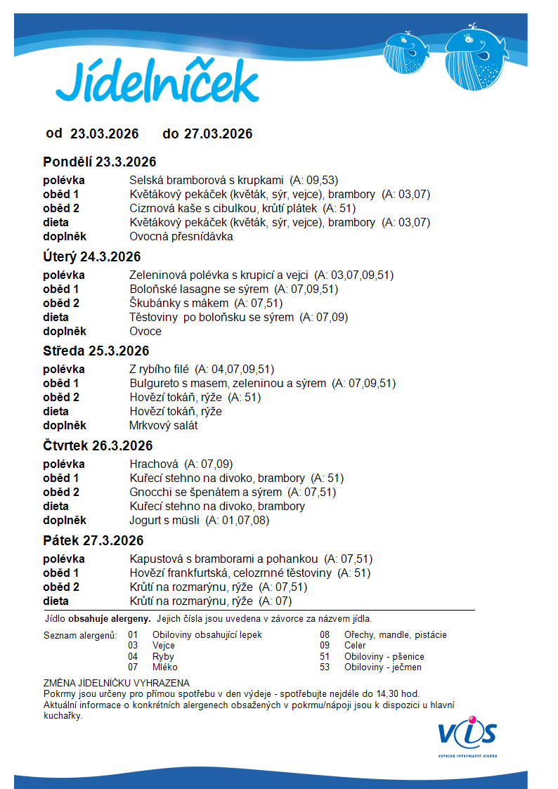 Jídelníček 23. 3. – 27. 3. 2026